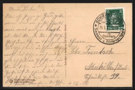 Personenbezogene Daten auf der Rückseite der Karte wurden durch blauen Textmarker unkenntlich gemacht. Die blauen Stellen sind auf die Vorderseite durchgeweicht und wirken sich negativ auf das Postkartenfoto aus