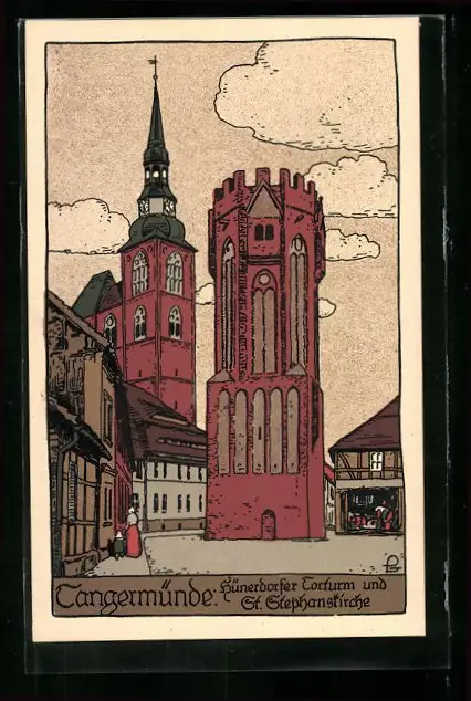 Steindruck-AK Tangermünde, Hünerdorfer Torturm und St. Stephanskirche
