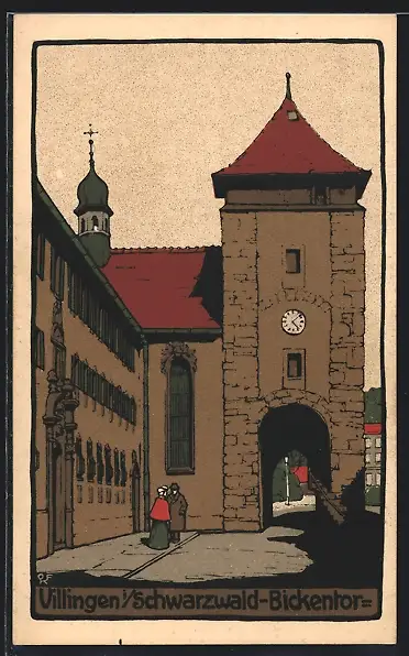 Steindruck-AK Villingen /Schwarzwald, Strassenpartie am Bickentor