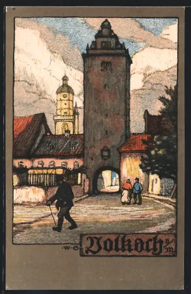 Steindruck-AK Volkach a. M., Spaziergänger am Stadttor