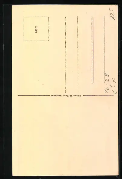 Personenbezogene Daten auf der Rückseite der Karte wurden durch blauen Textmarker unkenntlich gemacht. Die blauen Stellen sind auf die Vorderseite durchgeweicht und wirken sich negativ auf das Postkartenfoto aus