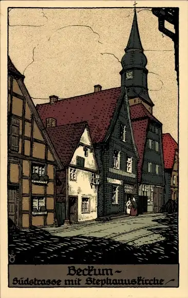 Steindruck Ak Beckum im Kreis Warendorf, Südstraße mit Stephanuskirche