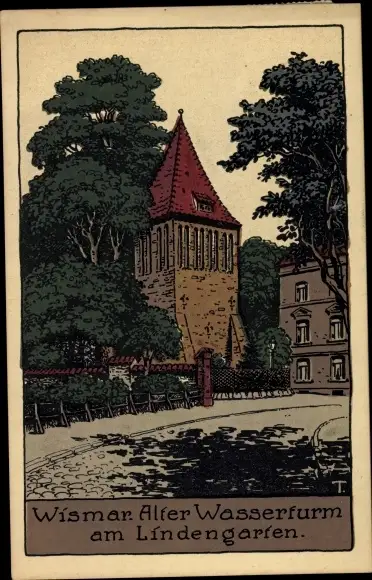 Steindruck Ak Hansestadt Wismar, Alter Wasserturm am Lindengarten