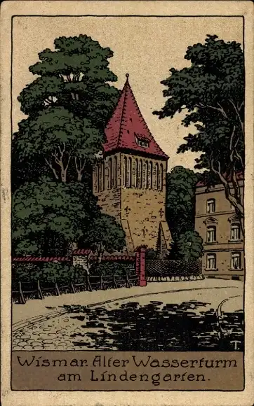 Steindruck Ak Hansestadt Wismar, Alter Wasserturm am Lindengarten