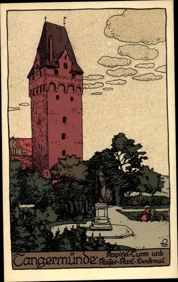 Steindruck Ak Tangermünde in Sachsen Anhalt, Kapitelturm und Kaiser Karl Denkmal