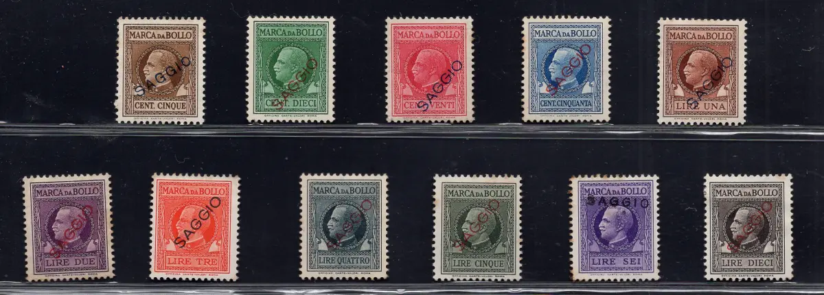 M - ohne Gummi - Vitt. Emanuele III. - Serie von 11 verschiedenen Werten, die in rot oder schwarz aufgedruckt sind - vergilbter oder teilweiser Gummi - Hochwertiges Set für Spezialisten Cod. 3208/WEB