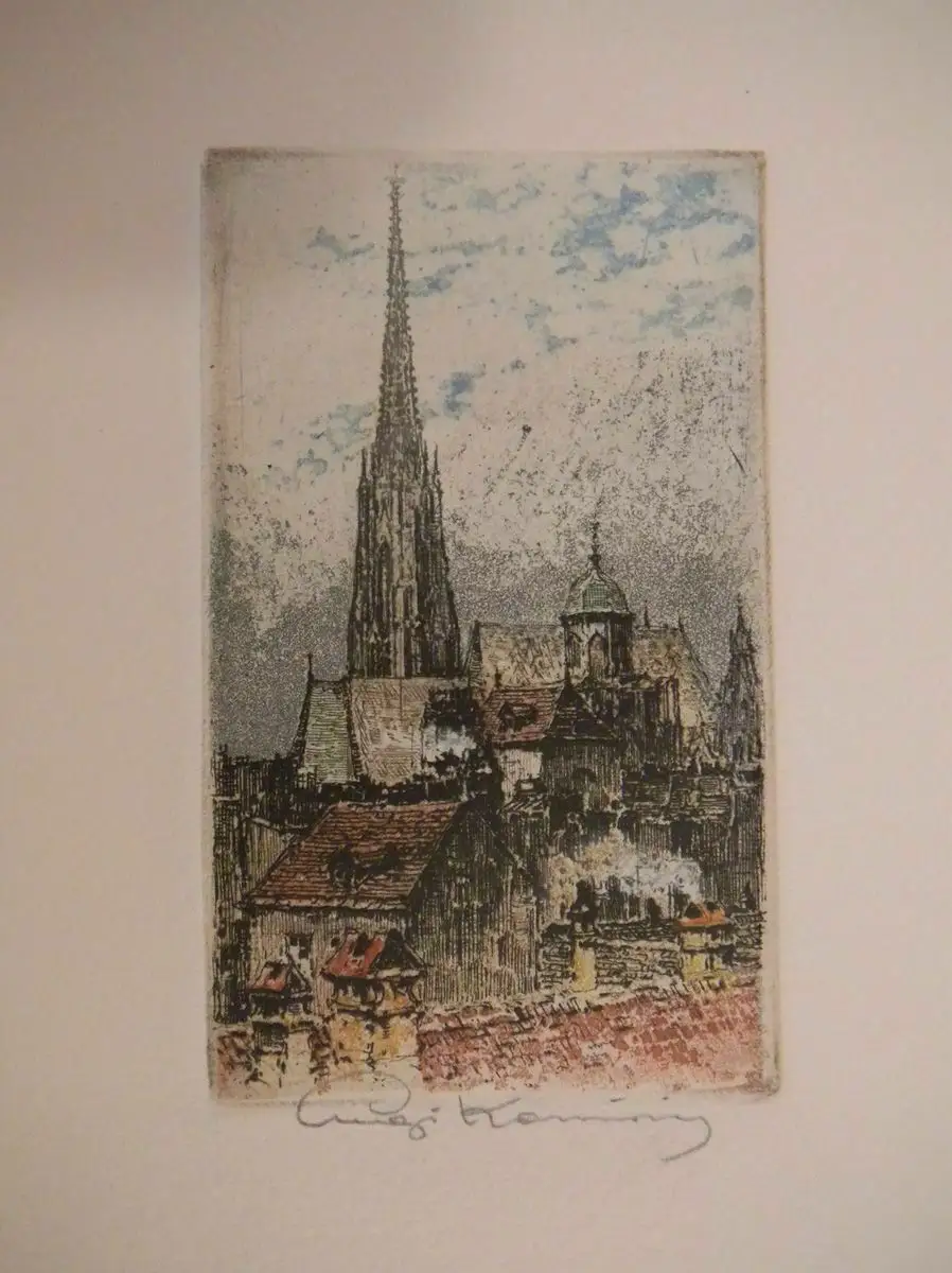 [ca. 1930]. Orig.-Farbradierung. 24, 5 x 19 cm. (Blattgr.);14 x 6, 5 cm. (Plattengr.). Breitrandiges Exemplar. In sehr gutem Zustand.