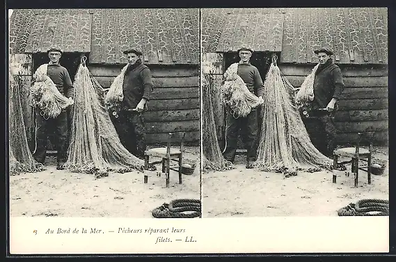 Stereo-AK Au Bord de la Mer, L`echeurs reparant leurs filets, Fischer