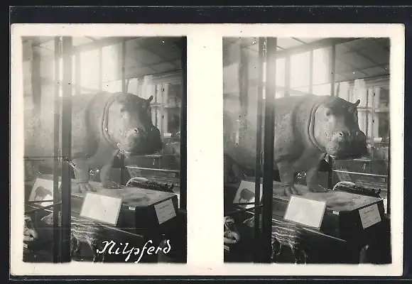 Stereo-AK Ausgestopftes Nilpferd in einem Museum