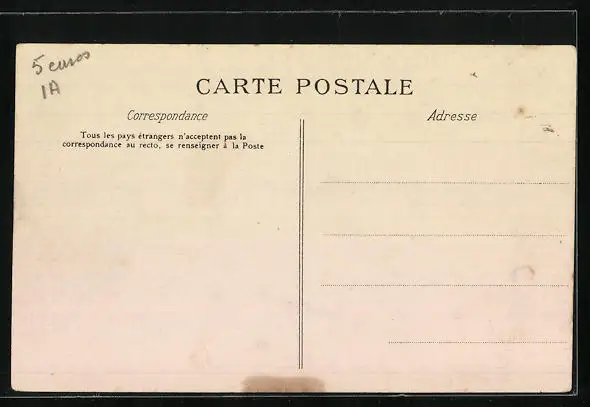 Personenbezogene Daten auf der Rückseite der Karte wurden durch blauen Textmarker unkenntlich gemacht. Die blauen Stellen sind auf die Vorderseite durchgeweicht und wirken sich negativ auf das Postkartenfoto aus