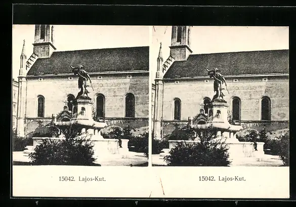 Stereo-AK Lajos-Kut, Kirche mit Brunnen