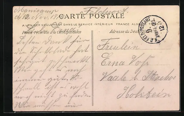 Personenbezogene Daten auf der Rückseite der Karte wurden durch blauen Textmarker unkenntlich gemacht. Die blauen Stellen sind auf die Vorderseite durchgeweicht und wirken sich negativ auf das Postkartenfoto aus