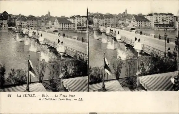 Stereo Ak Bâle Basel Stadt Schweiz, Le Vieux Pont et l'Hotel des Trois Rois