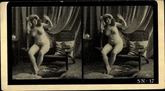 Stereo Ak Nackte Frau, sitzend, Busen, Beine