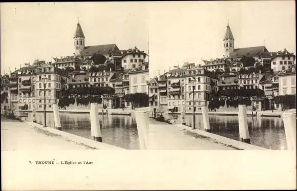 Stereo Ak Thun Thun Kanton Bern Schweiz, Kirche und Aare