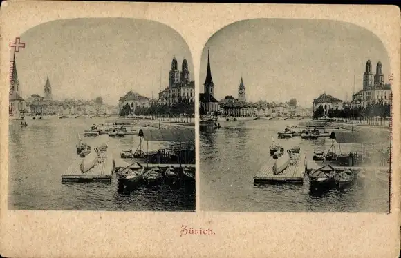 Stereo Ak Zürich Stadt Schweiz, Boote am Anleger, Stadt