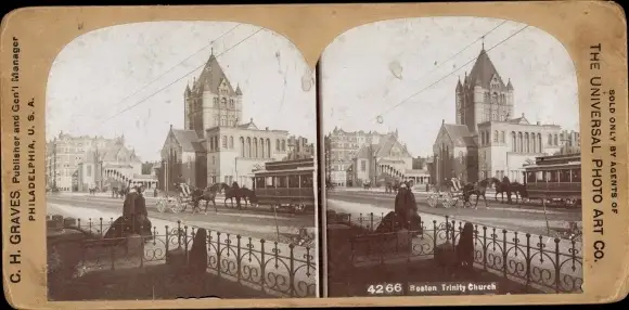 Stereo Foto Boston Massachusetts USA, Trinity Church, Pferdebahn