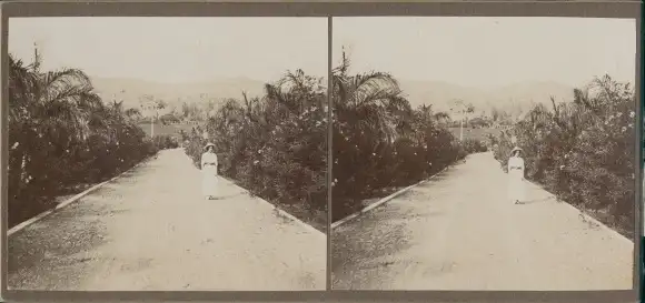 Stereo Foto Kuba, um 1915, Frau posiert auf einer Straße, Palmen