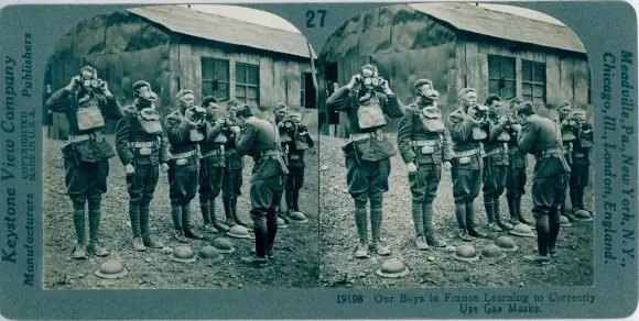 Stereo Foto Learning to use gas masks, US Army, France, I WK