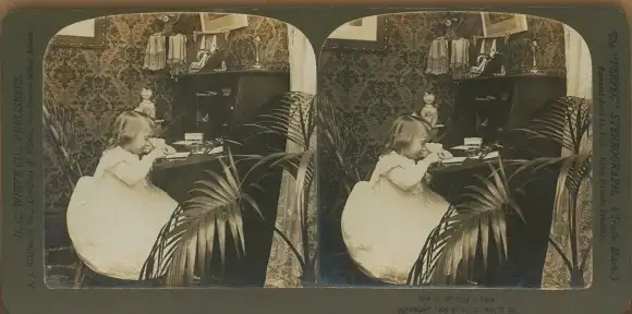 Stereo Foto Mädchen schreibt einen Brief an den Papa, Portrait