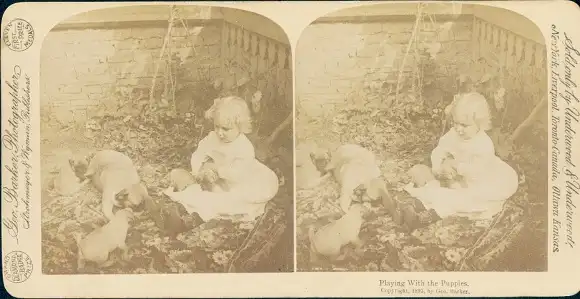 Stereo Foto Mädchen spielt mit Hundewelpen