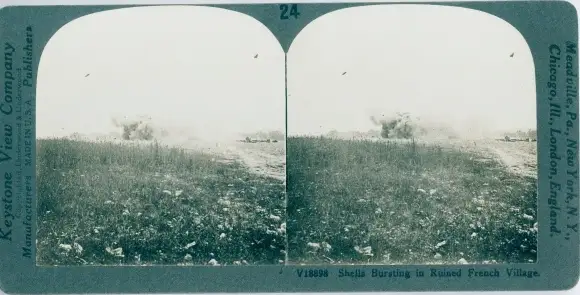 Stereo Foto Shells bursting in ruined french village, I WK