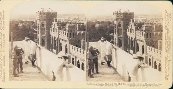 Stereo Foto Tientsin China, Foreigners on German Club watching Battle of Tientsin