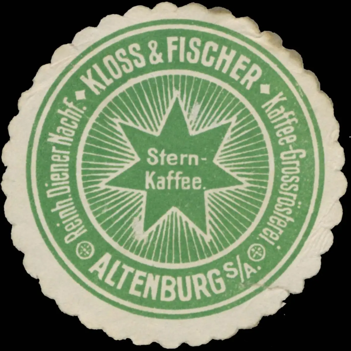 Kaffee-Grossrösterei Kloss & Fischer, Reinh. Diener Nachf. Grün, Größe/Zustand: 5 , beschädigt, Original alte Reklamemarke die seinerzeit für die Werbung benutzt wurde
