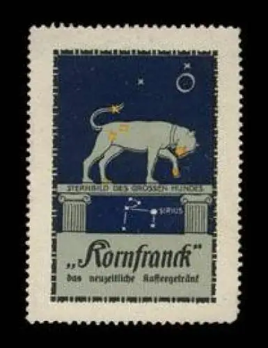 Kornfranck das neuzeitliche Kaffeegetränk. Sternbild des grossen Hundes. Rückseite mit Informationen, Größe/Zustand: 6x4 , guter Zustand, Original alte Reklamemarke die seinerzeit für die Werbung benutzt wurde