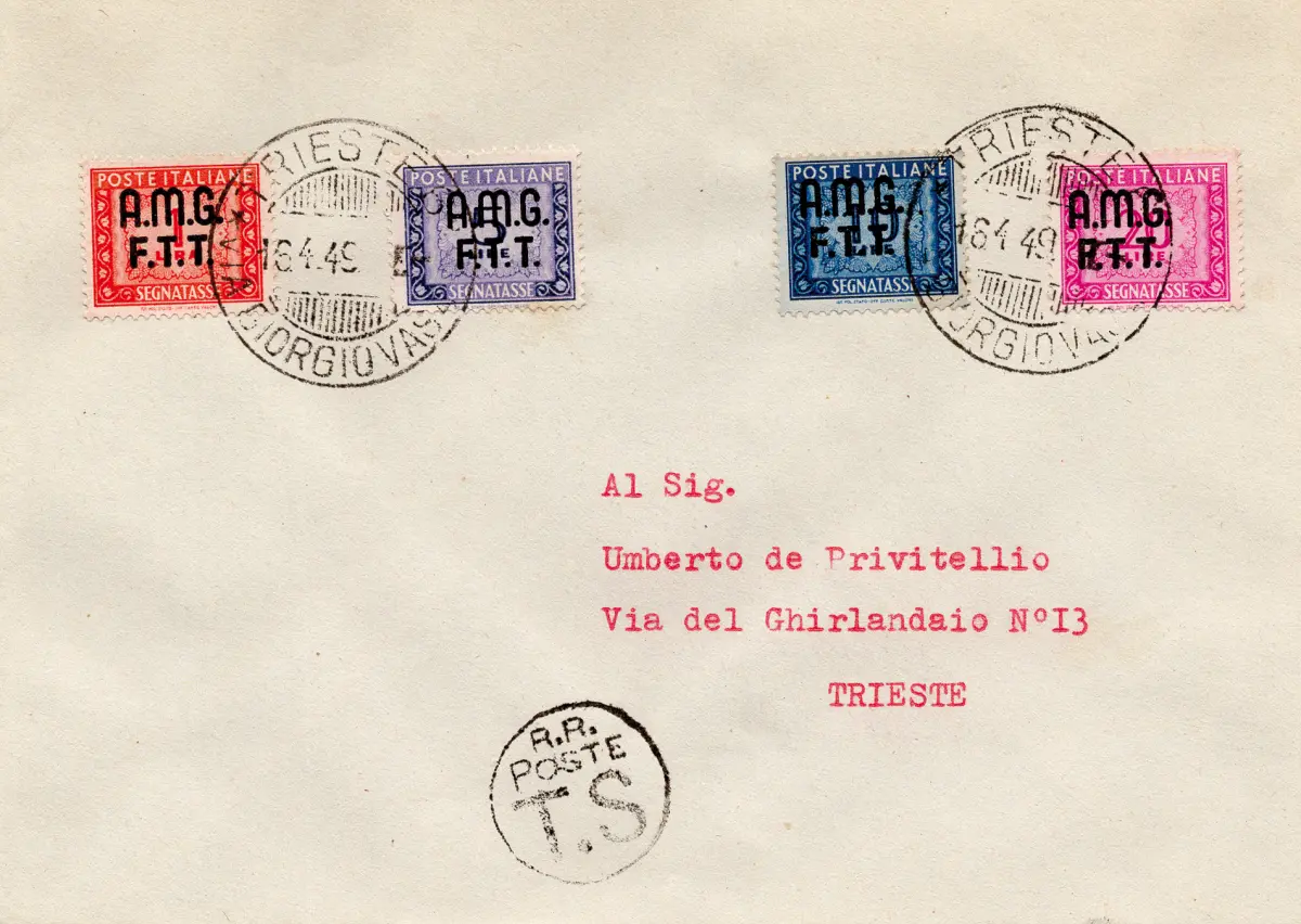 Umschlag - Steuermarken Lire 1, 5, 10 und 20 die vier am 15.4.49 ausgegebenen Werte auf Umschlag wurden am Tag nach der Ausgabe in Triest storniert - Ungewöhnlich Cod. 1037/17