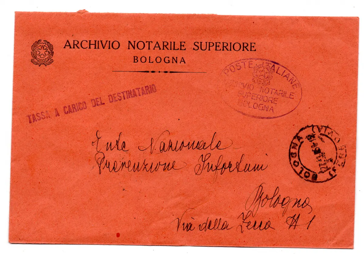 Steuermarken Sterne Lire 8 Paar auf Steuerumschlag bei der Ankunft - Steuermarken Sterne Lire 8 Nr. 112 Paar (defekt) + Ergänzungen Nr. 99 + 102 auf Steuerumschlag bei der Ankunft in Bologna am 28.3.58 (Steuer zu tragen) - Gelegenheit Nr. 1109/A