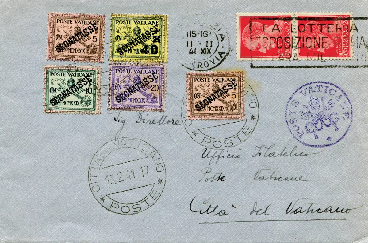 Steuermarken - Umschlag, der am 11.2.41 von Venedig in den Vatikan verschickt wurde Umschlag - Steuermarken - Umschlag, der am 11.2.41 von Venedig in den Vatikan verschickt wurde, frankiert mit zwei Exemplaren von Cent. 20 Imperial pro Cent besteuert. 80 fünf Werte der Steuermarken (Nr. 1 x 2, Nr. 2, Nr. 3 und Nr. 4) - neben Jahrgang. Stempelrund der Vatikanischen Post - leichte Vergilbungen um die Verzahnung - Selten, für Spezialisten Cod. 831/15