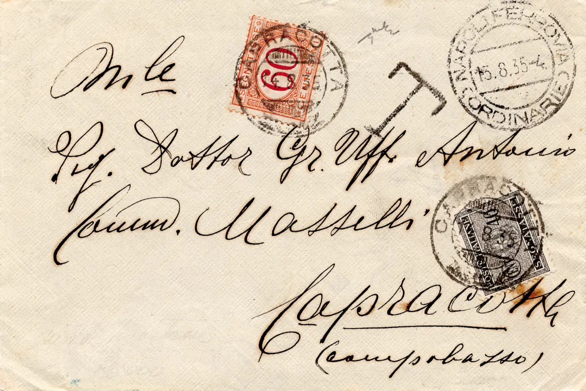 Gemischte Steuermarken zwei Emissionen BÜSTE - Gemischte Steuermarken zwei Emissionen - Cent. 60 Orange und Karmin Nr. 26 + komplementäre Cent. 40 Nr. 39 auf unfrankiertem Umschlag von Neapel nach Capracotta am 13.8.35 besteuert bei Ankunft - Interessante späte Verwendung Cod.91/182