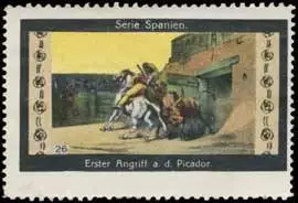 Erster Angriff an den Picador, Serie Spanien, Bild 26, Größe/Zustand: 4x6 , guter Zustand, Original alte Reklamemarke die seinerzeit für die Werbung benutzt wurde