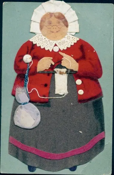 Stoff Ak Alte Dame beim Stricken, Beutel