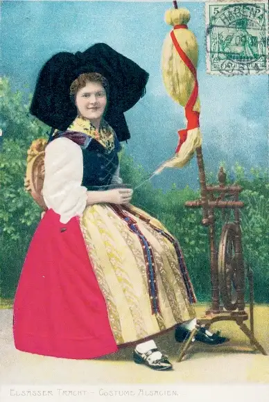 Stoff Ak Elsässerin am Spinnrad, Elsässer Tracht