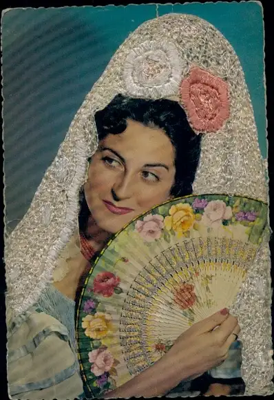 Stoff Ak Frau in spanischer Tracht, Porträt, Fächer