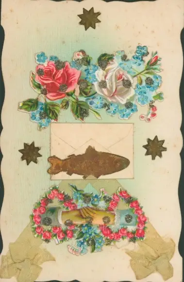 Stoff Ak Glückwunsch 1. April, Fisch, Vergissmeinnicht, Rosen, Stoffschleifen