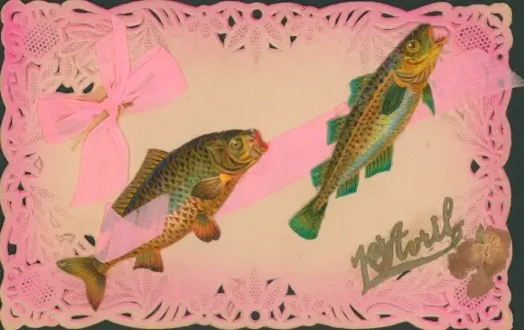 Stoff Ak Glückwunsch 1. April, Zwei Fische, Stoffschleife