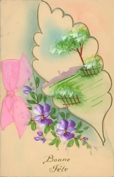 Stoff Ak Glückwunsch, Bonne Fete, Stoffschleife, Veilchen, Baum