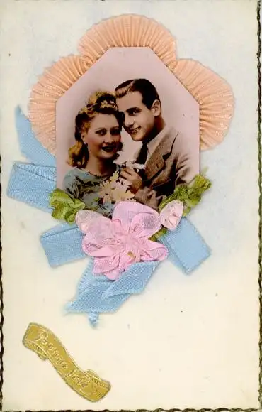 Stoff Ak Glückwunsch, Liebespaar, Schleife