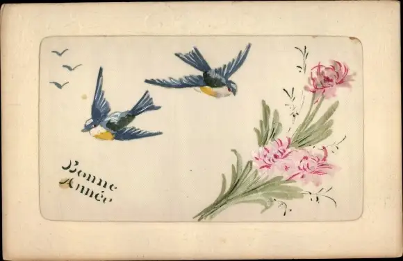 Stoff Ak Glückwunsch Neujahr, Blumen, Vögel