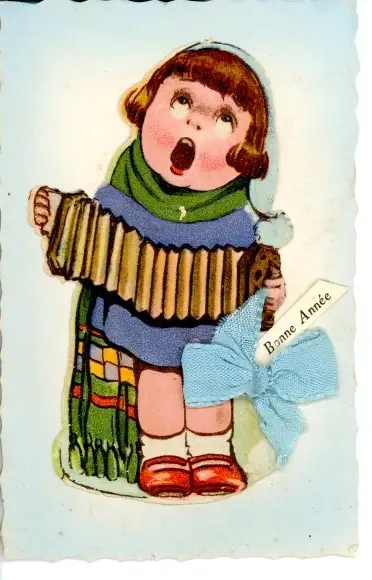 Stoff Ak Glückwunsch Neujahr, Singendes Mädchen mit Akkordeon