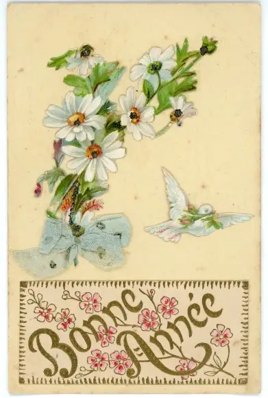 Stoff Ak Glückwunsch Neujahr, Taube, Blumenstrauß, Stoffschleife