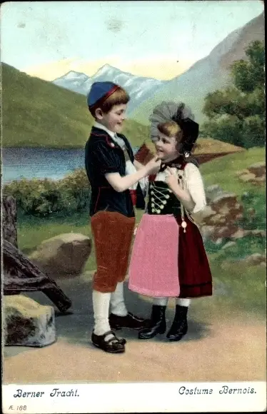 Stoff Ak Kanton Bern Schweiz, Kinder in Berner Volkstracht, Costume Bernois