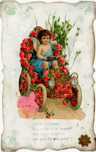 Stoff Ak Kleiner Engel fährt Auto, Rosen, Schleife, Pflanze