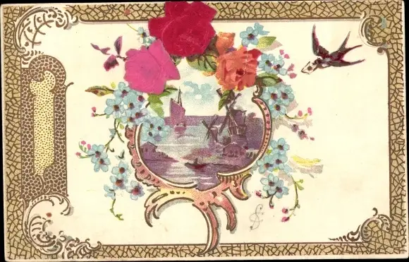 Stoff Ak Landschaft mit Windmühle und Segelboot, Rosen, Vergissmeinnicht, Schwalbe, Kitsch