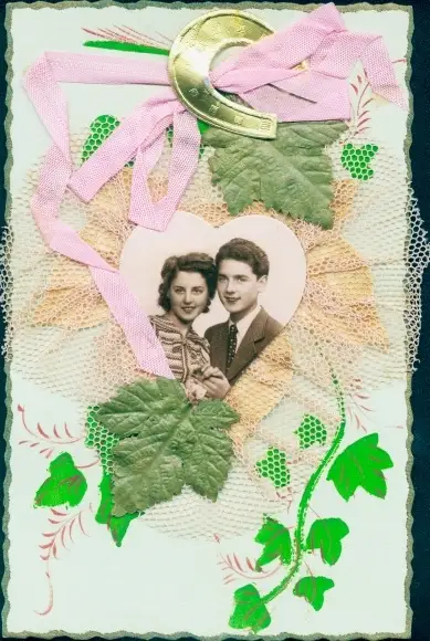 Stoff Ak Liebespaar, Hufeisen, Schleife, Laubblätter, Kitsch