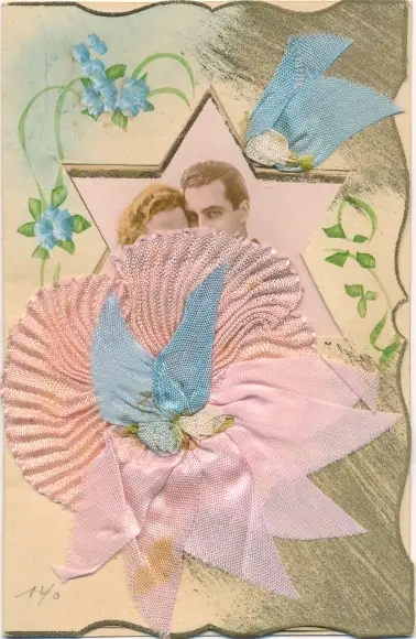Stoff Ak Liebespaar, Schleifen, Vergissmeinnicht