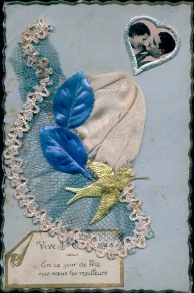 Stoff Ak Liebespaar, Schwalbe, Kitsch